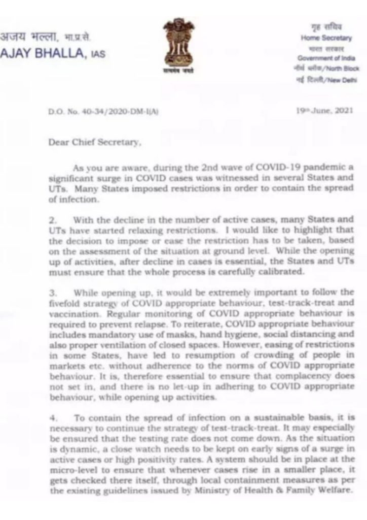 তিনি লিখেছেন, কোনো জায়গার বর্তমান পরিস্থিতি মূল্যায়নের ভিত্তিতেই বিধিনিষেধ শিথিলের সিদ্ধান্ত নিতে হবে। সংক্রমণ হ্রাস পেলে স্বাভাবিক ছন্দে ফেরার প্রস্তুতি নিতে হবে ধাপে ধাপে। তবে কোভিড মোকাবিলার উপযুক্ত আচরণবিধি এবং অন্যান্য বিষয়গুলিতেও সমান ভাবে গুরুত্ব বজায় রাখতে হবে।